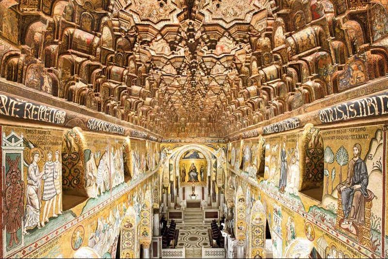 Le magnifique plafond à muqarnas de la Chapelle Palatine témoigne de l’adaptation de l’esthétique islamique au sein d’un édifice chrétien. Peint et doré avec une rare finesse, il reflète le talent des artisans arabes, créant une harmonie artistique saisissante. Vous contemplerez un décor unique, témoin d’un savant métissage culturel fascinant.