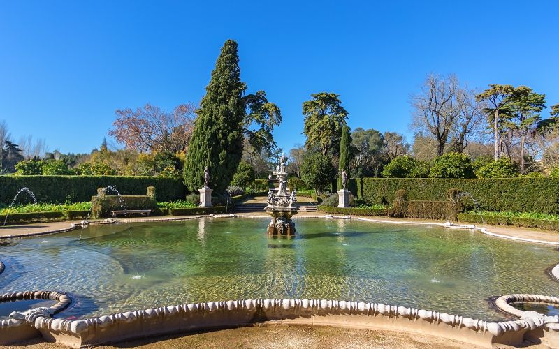 Les Jardins ornementaux, conçus dans la tradition des parcs à la française, offrent un cadre idyllique au palais. Leurs fontaines, agrémentées de sculptures allégoriques, rythment les allées symétriques tandis que des bosquets soigneusement taillés magnifient l’ensemble. Commandés par la reine Maria I, ils témoignent du goût de la cour pour l’harmonie et la perfection visuelle. On y trouve également des statues de divinités, rappelant l’influence du style rococo dans l’aménagement.