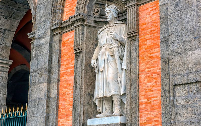 Les huit statues nichées sur la façade, donnant sur la grandiose Piazza del Plebiscito, honorent divers rois de Naples. Cependant, cette ornementation fut décidée bien plus tard, au XIXe siècle, rompant ainsi avec le plan d’origine. Aujourd’hui, elles constituent un clin d’œil historique et fortement symbolique à la lignée royale napolitaine.