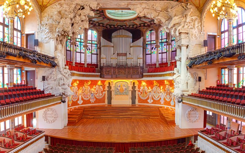 La salle de concert, inaugurée en 1908, demeure l’un des points culminants de la visite. Sa vaste verrière centrale, conçue comme un soleil inversé, inonde l’espace de lumière naturelle. L’orgue monumental, fabriqué par la maison Walcker, trône en majesté au-dessus de la scène, rappelant la vocation musicale du lieu. Cette salle, conçue pour offrir une acoustique remarquable, a accueilli de nombreux artistes renommés, faisant écho au prestige culturel de Barcelone.