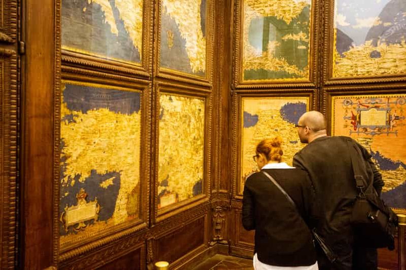 La Salle des Cartes géographiques, ou Guardaroba, fut conçue vers 1563 par Giorgio Vasari pour Cosme Ier de Médicis. Ornée de 53 cartes peintes sur panneaux de bois, elle reflète la vision du monde de la Renaissance et l’aspiration de Florence à accroitre son influence. Un globe occupe le centre, révélant la curiosité de l’époque. Vous apprécierez la richesse particulièrement historique de ces représentations cartographiques agrémentées de détails artistiques uniques.
