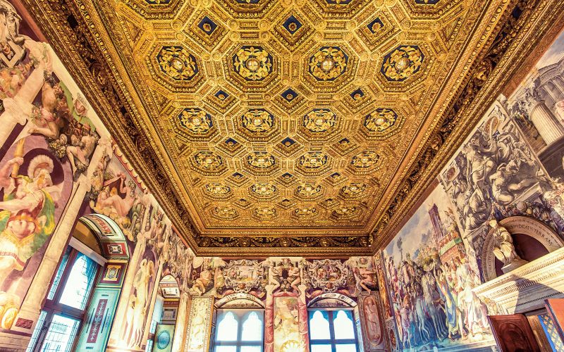 Le Salone dei Cinquecento, érigé en 1494 sous l’impulsion du moine Savonarole, demeure la salle la plus vaste du Palazzo Vecchio. Au XVIe siècle, Giorgio Vasari en agrandit et orna les murs de fresques célébrant la puissance florentine. À proximité, le raffiné Studiolo de Francesco I, également décoré par Vasari, recèle des cabinets secrets et des œuvres d’art ésotériques. Vous serez impressionné par l’atmosphère et la splendeur de ces espaces.