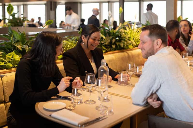 Savourez une entrée, un plat et un dessert. Les boissons sont incluses : savourez une coupe de champagne, du vin, de l'eau et du café. Sièges avec vue sur la Seine (vue sur le Trocadéro, pas de table près de la fenêtre).