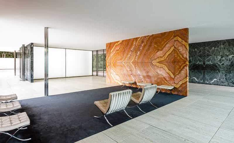 L’Onyx Wall constitue l’élément le plus spectaculaire du pavillon, un vestige de l’Exposition internationale de Barcelone de 1929 méticuleusement réinstallé lors de la reconstruction de 1986. Cette paroi d’onyx doré d’Algérie capte la lumière de manière exceptionnelle grâce à sa translucidité unique, créant des variations chromatiques selon l’heure de la journée. Sa présence transforme ce matériau naturel en véritable partition spatiale, organisant la circulation tout en servant de point focal majeur dans le parcours architectural imaginé par Mies van der Rohe.