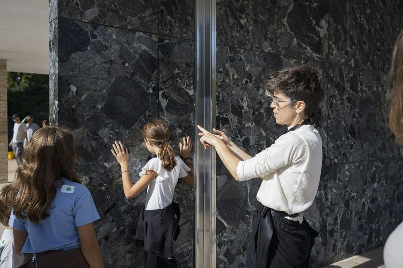 Le travertin romain, pierre italienne aux tonalités claires et à la texture poreuse irrégulière, structure l’ensemble du pavillon depuis sa conception originale. Ce matériau, choisi pour sa luminosité naturelle et sa capacité à dialoguer avec la lumière méditerranéenne, guide la circulation des visiteurs tout en affirmant la pureté géométrique chère à l’architecte. Les grandes dalles continues soulignent l’horizontalité radicale du bâtiment et illustrent la philosophie du less is more, où chaque matériau est célébré pour ses qualités intrinsèques sans ornement superflu.