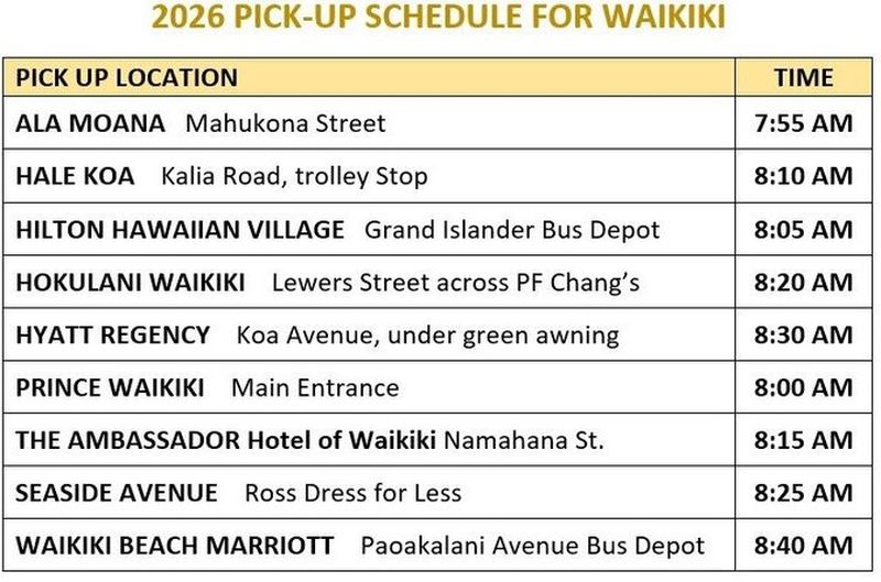 | Pearl Harbor Aviation Museum | Toute l’année | Tous les jours | 09h00 – 17h00 | Accessible via navette depuis le centre des visiteurs |