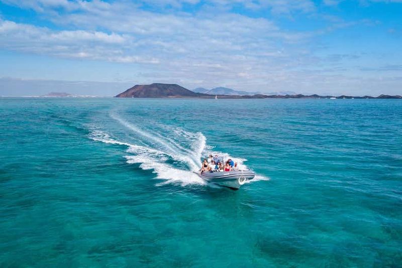 Partez en water taxi vers l'île de Lobos depuis Corralejo. Vous rejoindrez une île aux eaux cristallines située entre Fu...