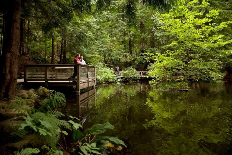 Inauguré en 2004, Treetops Adventure propose un ensemble unique de passerelles suspendues parmi des cèdres centenaires. Élevées jusqu’à 33 mètres, ces plates-formes offrent un point de vue inoubliable sur la canopée.