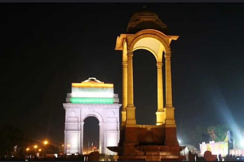 La canopée située à proximité, autrefois abritant la statue du roi George V, est un vestige historique de l’époque britannique. Conçue dans un style architectural similaire à la Porte de l’Inde, elle se distingue par son dôme reposant sur quatre piliers gracieux. Aujourd’hui, la statue originale n’y est plus, mais la canopée demeure un point d’intérêt pour les visiteurs, symbolisant l’évolution du paysage culturel indien et la transition vers l’indépendance.