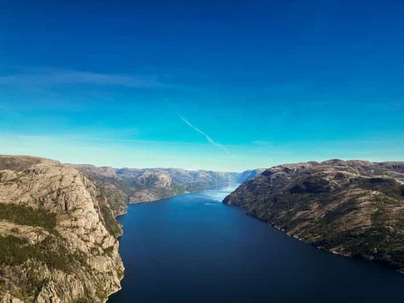 Une fois au sommet, le regard embrasse toute la majesté du Lysefjord, une entaille glaciaire de 42 kilomètres de long creusée à la fin de la dernière période glaciaire. Depuis ce belvédère naturel, la vue plongeante sur le fjord est saisissante, les parois de granit tombant à pic dans des eaux dont la profondeur dépasse par endroits les 400 mètres. La lumière changeante et l’immensité du paysage font de cet endroit l’un des sujets photographiques les plus prisés de Scandinavie.