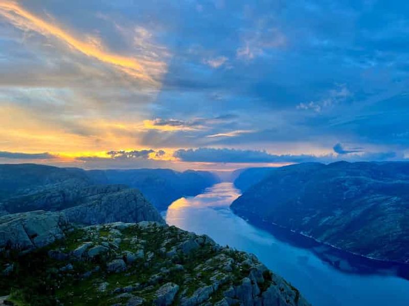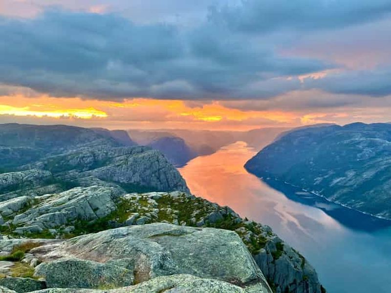 Une fois au sommet, le regard embrasse toute la majesté du Lysefjord, une entaille glaciaire de 42 kilomètres de long creusée à la fin de la dernière période glaciaire. Depuis ce belvédère naturel, la vue plongeante sur le fjord est saisissante, les parois de granit tombant à pic dans des eaux dont la profondeur dépasse par endroits les 400 mètres. La lumière changeante et l’immensité du paysage font de cet endroit l’un des sujets photographiques les plus prisés de Scandinavie.