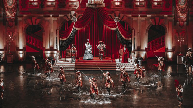 Ce spectacle, inauguré en 2006, vous invite à l’époque du cardinal de Richelieu et de ses célèbres gardes. Sur scène, vous suivrez l’histoire romantique d’un jeune noble mêlant duels d’escrime, danses flamenco et prouesses équestres. Les décors baroques, agrémentés d’effets spectaculaires d’eau, vous transporteront dans une ambiance feutrée et passionnée.