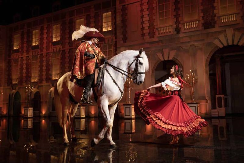 Ce spectacle, inauguré en 2006, vous invite à l’époque du cardinal de Richelieu et de ses célèbres gardes. Sur scène, vous suivrez l’histoire romantique d’un jeune noble mêlant duels d’escrime, danses flamenco et prouesses équestres. Les décors baroques, agrémentés d’effets spectaculaires d’eau, vous transporteront dans une ambiance feutrée et passionnée.