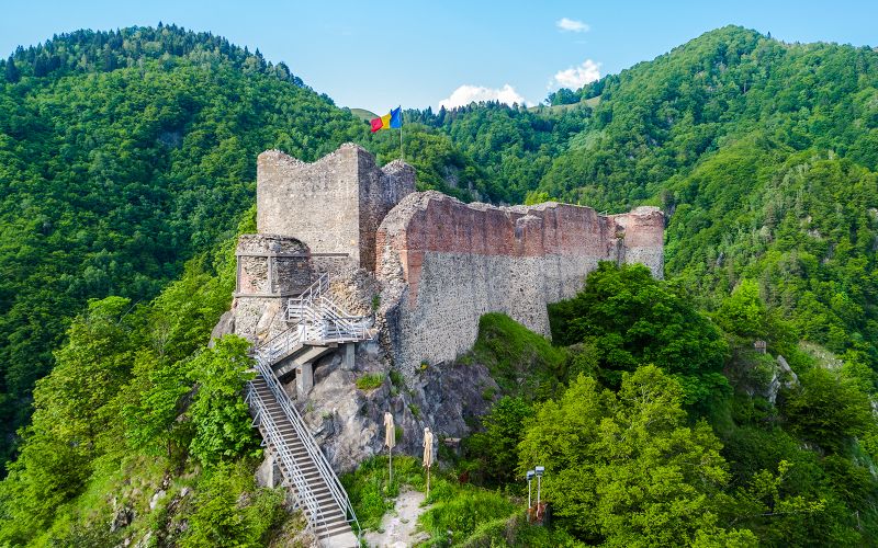 Érigée initialement au XIIIe siècle par la famille Basarab, la Citadelle de Poenari fut renforcée par Vlad l’Empaleur au XVe siècle. Nichée au sommet d’un éperon rocheux surplombant la vallée de l’Argeș, elle se rejoint après gravir 1 480 marches. Aujourd’hui en ruines, ce site chargé d’histoire offre une vue panoramique spectaculaire. Selon la légende, il fut un refuge stratégique pour l’illustre voïvode transylvain, inspirant de nombreux récits et mythes.