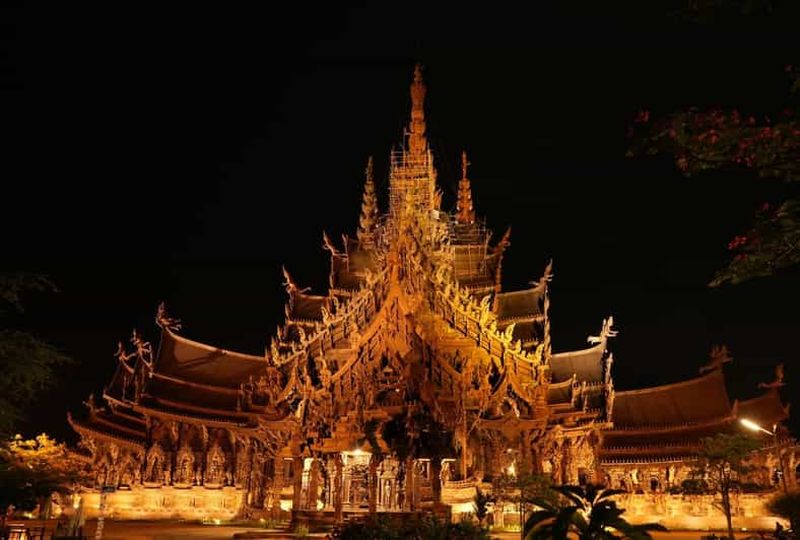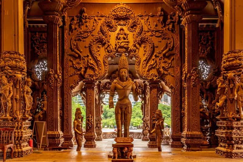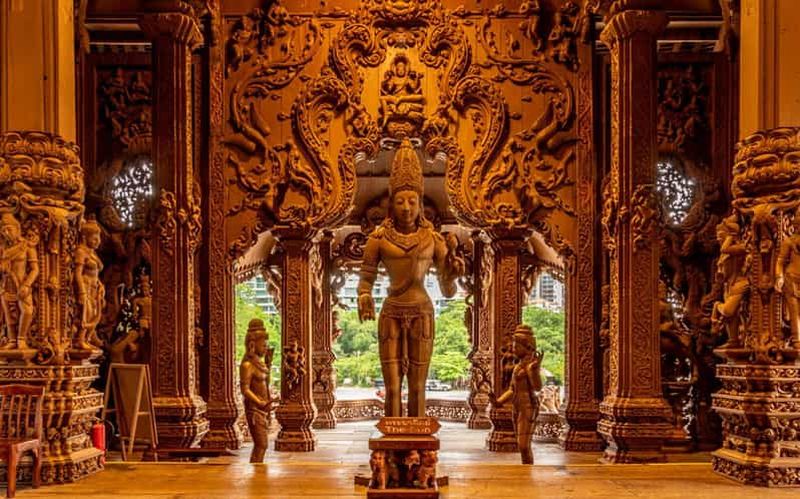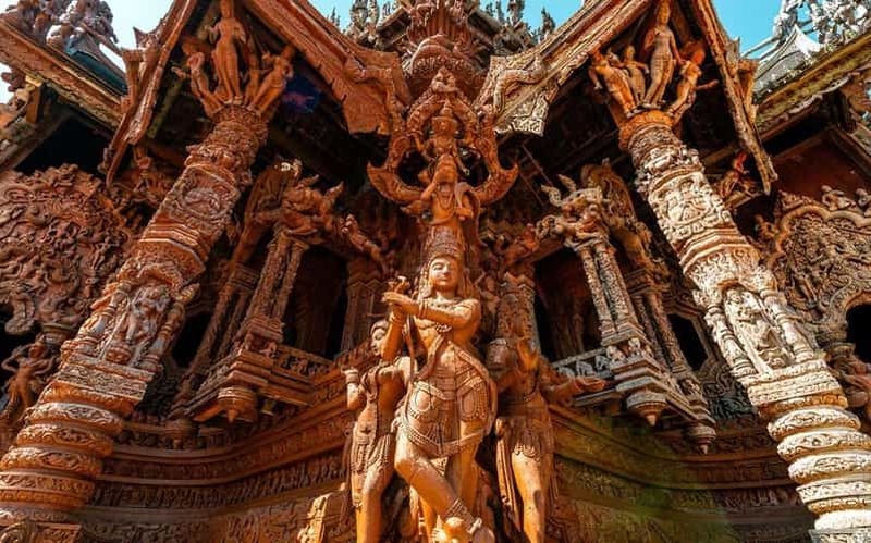 Ce monument majestueux est encore en construction, prévue pour s’achever en 2050. Chantier spectaculaire, il est érigé entièrement en teck, bois réputé pour sa durabilité. Sur ses 105 mètres de haut, le Sanctuaire de la Vérité présente des sculptures complexes dédiées à la mythologie thaïlandaise, indienne, cambodgienne et chinoise. Utilisant des techniques traditionnelles de menuiserie, l’absence de clous métaphorise la fluidité et la pérennité de la culture et de la foi humaine.