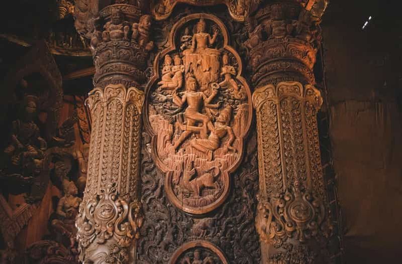Érigée en 1981 par l’homme d’affaires thaïlandais Lek Viriyaphant, la façade monumentale du Sanctuaire de la Vérité se distingue par ses somptueux motifs en bois sculpté. Chaque détail illustre harmonieusement les légendes bouddhistes et hindoues, valorisant un savoir-faire artistique ancestral. Longue de plusieurs mètres, elle est le fruit d’une expertise transmise de génération en génération. Les artisans locaux y travaillent, veillant à perpétuer la magnificence sculpturale qui émerveille dès l’entrée.