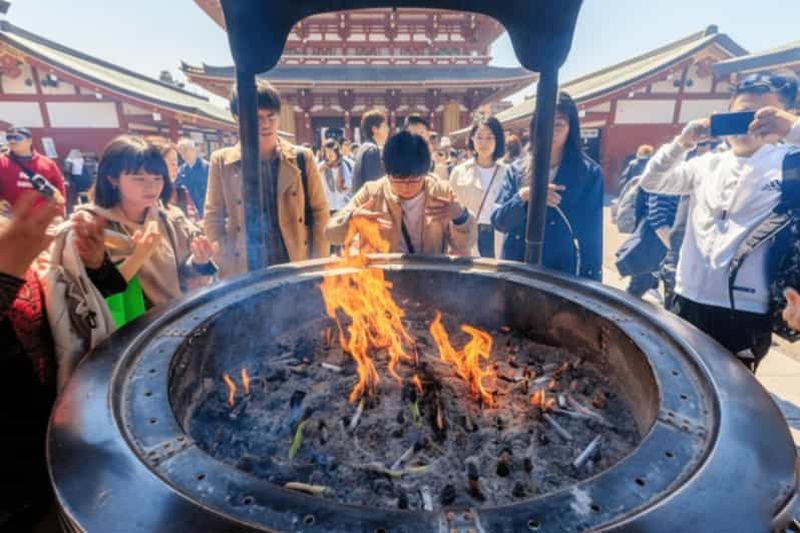 La grande vasque d’encens, nommée Jokoro, se dresse devant la salle principale du Temple Senso-ji. Les fidèles et visiteurs s’y rassemblent pour inhaler la fumée sacrée, symbole de purification. Érigé au cours de l’époque Edo, ce brûleur imposant demeure un symbole de dévotion. On raconte que poser la fumée sur la partie douloureuse de son corps contribuerait à la guérir. C’est un lieu incontournable pour s’imprégner de la spiritualité bouddhiste.