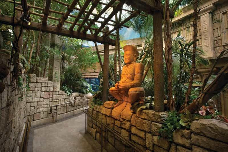 Tout au long du parcours, l’architecture s’inspire d’un temple maya, avec des gravures et sculptures évoquant les civilisations disparues. Inauguré lors de l’expansion de 2009, ce concept thématique plonge immédiatement les visiteurs dans une ambiance immersive. Les couloirs ornés d’arches détaillées guident le public à travers les différentes zones, renforçant l’idée d’exploration. Cette mise en scène soigneusement élaborée contribue à rendre la visite du Shark Reef Aquarium encore plus dépaysante.