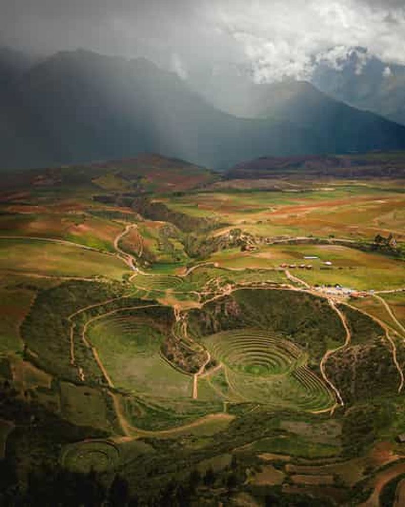 Les terrasses circulaires en gradins du site archéologique de Moray, datant de l’époque inca (XVe-XVIe siècles), forment des amphithéâtres. Elles s’enfoncent jusqu’à 30 m de profondeur. Chaque étage possède une température propre, créant un microclimat adapté à la recherche agricole. Les pierres parfaitement ajustées témoignent de l’ingéniosité de la civilisation inca. Ils utilisaient ces terrasses pour tester des cultures à différentes altitudes, démontrant ainsi l’avancée technologique et l’importance accordée à l’agriculture.