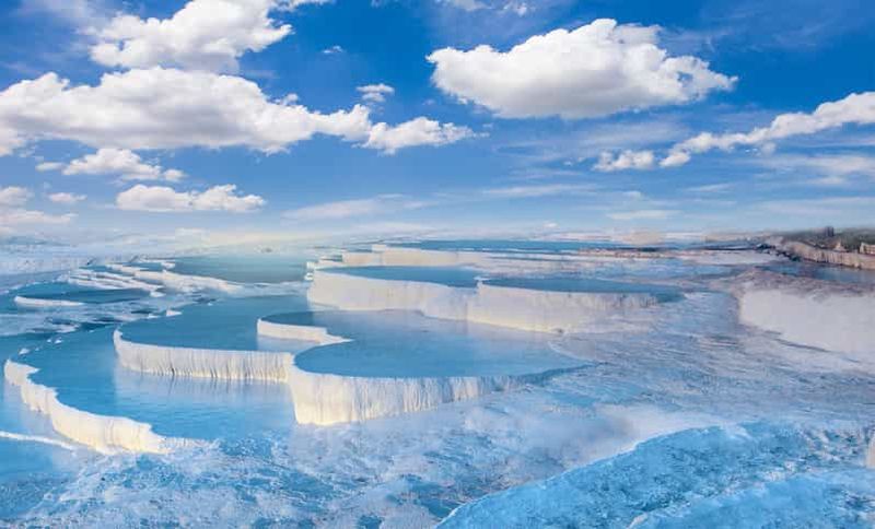 La formation de travertin, phénomène naturel, résulte du dépôt de carbonate de calcium dans des bassins en cascade. Créées par des sources chaudes saturées en minéraux, ces terrasses scintillantes sont connues depuis l’Antiquité pour leurs vertus thérapeutiques. Les eaux, pouvant atteindre 36 °C, invitent à la détente. Classées au patrimoine mondial de l’UNESCO, elles offrent un panorama époustouflant, où le blanc immaculé du calcaire contraste avec le ciel de Pamukkale.