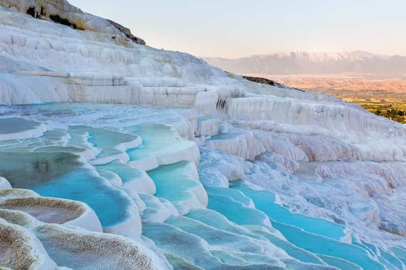 La formation de travertin, phénomène naturel, résulte du dépôt de carbonate de calcium dans des bassins en cascade. Créées par des sources chaudes saturées en minéraux, ces terrasses scintillantes sont connues depuis l’Antiquité pour leurs vertus thérapeutiques. Les eaux, pouvant atteindre 36 °C, invitent à la détente. Classées au patrimoine mondial de l’UNESCO, elles offrent un panorama époustouflant, où le blanc immaculé du calcaire contraste avec le ciel de Pamukkale.