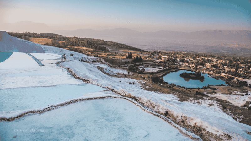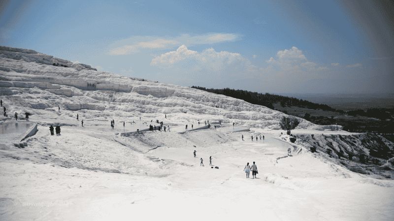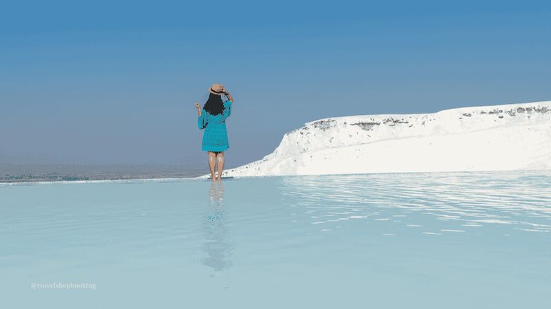 La formation de travertin, phénomène naturel, résulte du dépôt de carbonate de calcium dans des bassins en cascade. Créées par des sources chaudes saturées en minéraux, ces terrasses scintillantes sont connues depuis l’Antiquité pour leurs vertus thérapeutiques. Les eaux, pouvant atteindre 36 °C, invitent à la détente. Classées au patrimoine mondial de l’UNESCO, elles offrent un panorama époustouflant, où le blanc immaculé du calcaire contraste avec le ciel de Pamukkale.