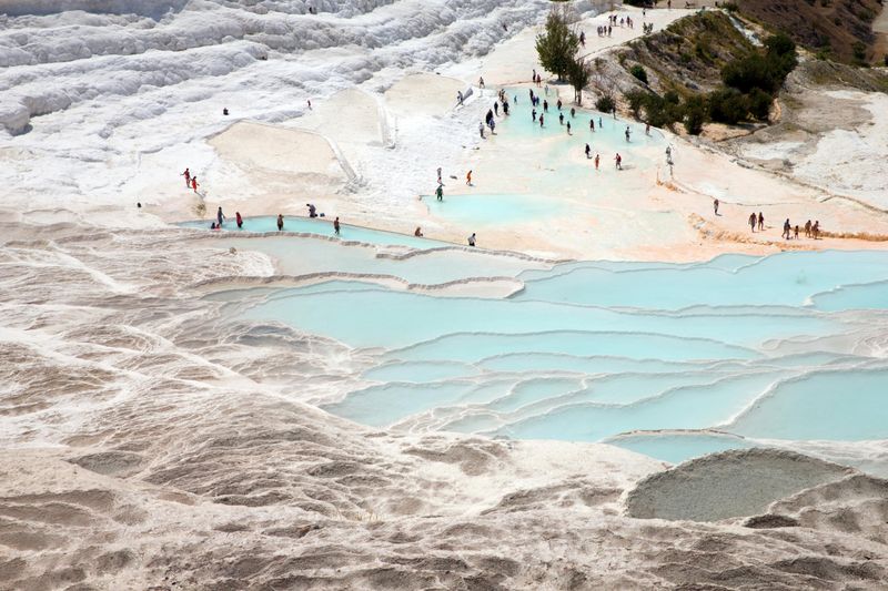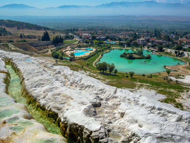 La formation de travertin, phénomène naturel, résulte du dépôt de carbonate de calcium dans des bassins en cascade. Créées par des sources chaudes saturées en minéraux, ces terrasses scintillantes sont connues depuis l’Antiquité pour leurs vertus thérapeutiques. Les eaux, pouvant atteindre 36 °C, invitent à la détente. Classées au patrimoine mondial de l’UNESCO, elles offrent un panorama époustouflant, où le blanc immaculé du calcaire contraste avec le ciel de Pamukkale.