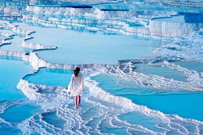 La formation de travertin, phénomène naturel, résulte du dépôt de carbonate de calcium dans des bassins en cascade. Créées par des sources chaudes saturées en minéraux, ces terrasses scintillantes sont connues depuis l’Antiquité pour leurs vertus thérapeutiques. Les eaux, pouvant atteindre 36 °C, invitent à la détente. Classées au patrimoine mondial de l’UNESCO, elles offrent un panorama époustouflant, où le blanc immaculé du calcaire contraste avec le ciel de Pamukkale.