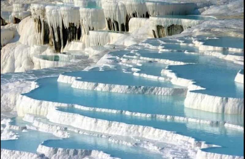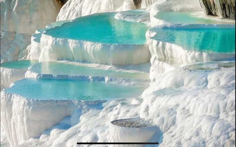 La formation de travertin, phénomène naturel, résulte du dépôt de carbonate de calcium dans des bassins en cascade. Créées par des sources chaudes saturées en minéraux, ces terrasses scintillantes sont connues depuis l’Antiquité pour leurs vertus thérapeutiques. Les eaux, pouvant atteindre 36 °C, invitent à la détente. Classées au patrimoine mondial de l’UNESCO, elles offrent un panorama époustouflant, où le blanc immaculé du calcaire contraste avec le ciel de Pamukkale.