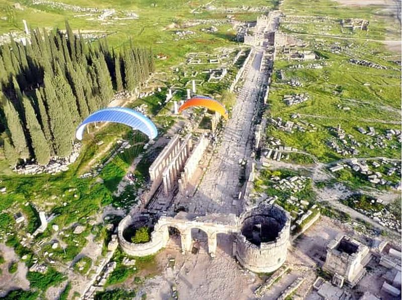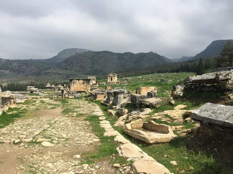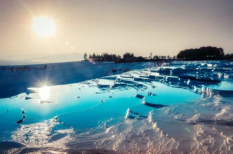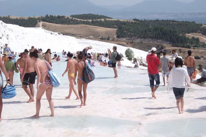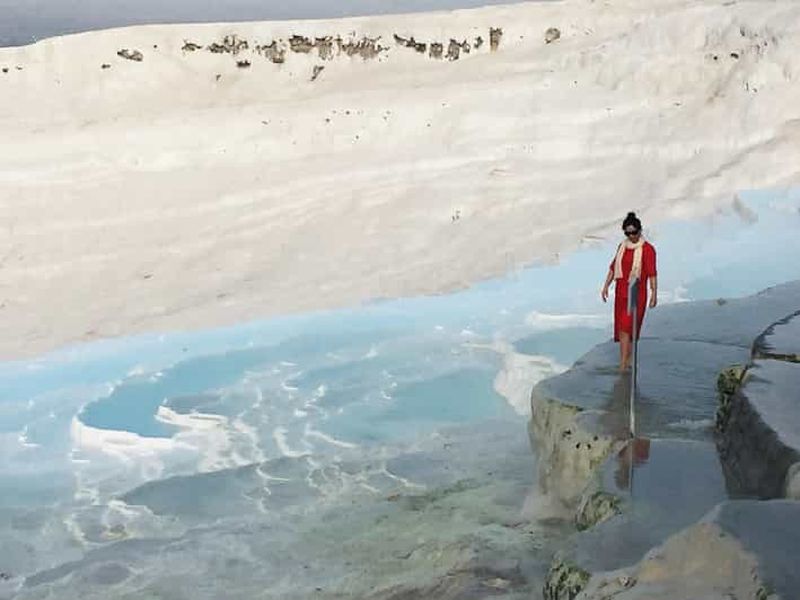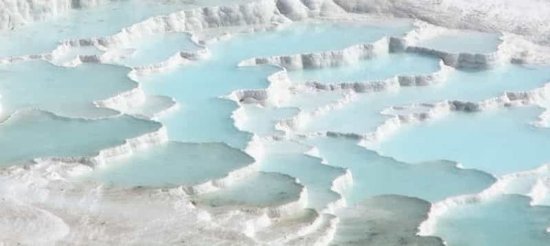 Les travertins de calcium de Pamukkale sont uniques en leur genre. Blancs et scintillants, avec des bassins bleu poudre en cascade, ils semblent sortis d'un rêve. Cette visite est pour un maximum de 14 personnes avec un minibus climatisé et un guide : carte gratuite de la Turquie et de Hiérapolis.