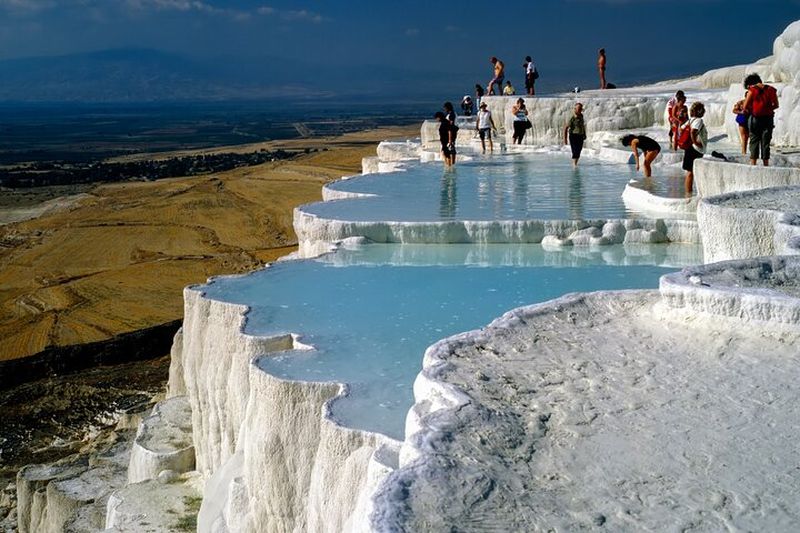 La formation de travertin, phénomène naturel, résulte du dépôt de carbonate de calcium dans des bassins en cascade. Créées par des sources chaudes saturées en minéraux, ces terrasses scintillantes sont connues depuis l’Antiquité pour leurs vertus thérapeutiques. Les eaux, pouvant atteindre 36 °C, invitent à la détente. Classées au patrimoine mondial de l’UNESCO, elles offrent un panorama époustouflant, où le blanc immaculé du calcaire contraste avec le ciel de Pamukkale.