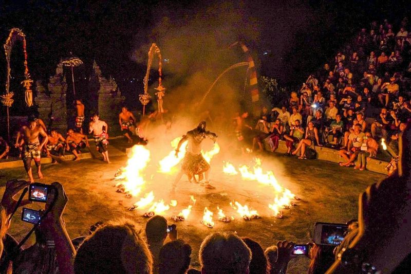 Plongez dans l’univers fascinant du Kecak, une danse balinaise née dans les années 1930 sous l’impulsion de Wayan Limbak. Représentant des passages épiques du Ramayana, ce spectacle en plein air réunit des dizaines de danseurs chantant “chak” en chœur, tandis que les costumes traditionnels et la chorégraphie rythmée vous transportent dans un monde mythique. Au final, la danse du feu ajoute une touche spectaculaire, sublimée par le coucher du soleil.