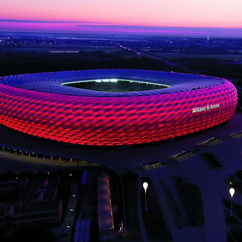 L’Allianz Arena, conçue par les architectes suisses Herzog & de Meuron, a ouvert ses portes en mai 2005. Son impressionnante façade est constituée de 2 760 panneaux en plastique gonflé, éclairés par un système LED permettant des animations colorées. Vous admirerez ce jeu de lumière qui illumine la nuit munichoise et signale l’identité du club lors des matchs. Véritable prouesse d’ingénierie, cette enveloppe innovante contribue à l’esthétique avant-gardiste du stade.