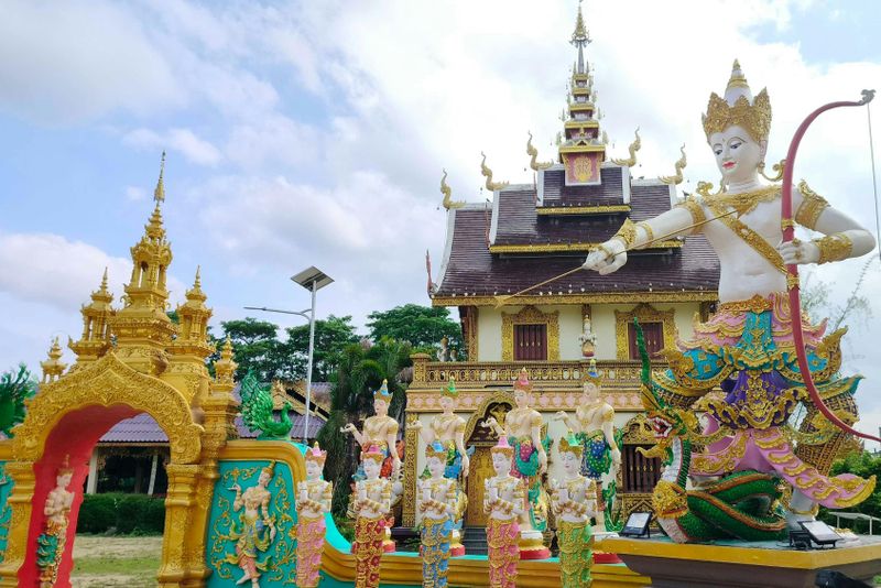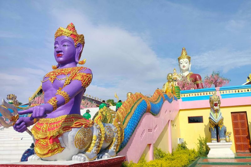 Partout dans l’enceinte, vous observerez des figures intrigantes allant des démons protecteurs aux divinités ailées. Ces sculptures, façonnées dans un style contemporain, reprennent néanmoins les codes esthétiques du bouddhisme thaï. L’artiste veut montrer l’affrontement entre bien et mal, invitant les visiteurs à réfléchir sur leur propre parcours spirituel. Certaines créatures sont issues de mythes asiatiques, tandis que d’autres semblent inspirées par la pop culture, reflétant la diversité d’influences présentes ici.