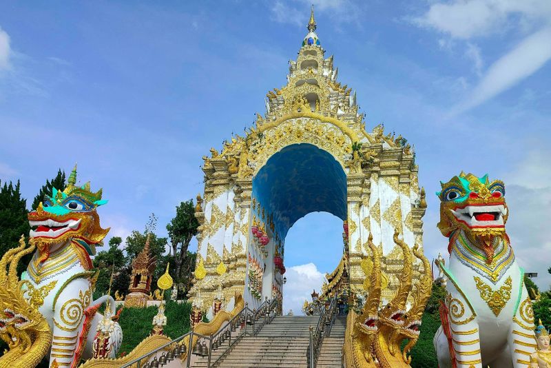 La structure principale du temple, d’un blanc éclatant, symbolise la pureté du Bouddha. L’utilisation abondante de miroirs incrustés ajoute une qualité réfléchissante, symbolisant la sagesse de Bouddha et incitant à la méditation. Chaque élément a une signification spirituelle, des sculptures imposantes aux symboles délicats, révélant des histoires inspirées par les enseignements bouddhistes. Ce mélange de tradition et modernité attire des visiteurs du monde entier.