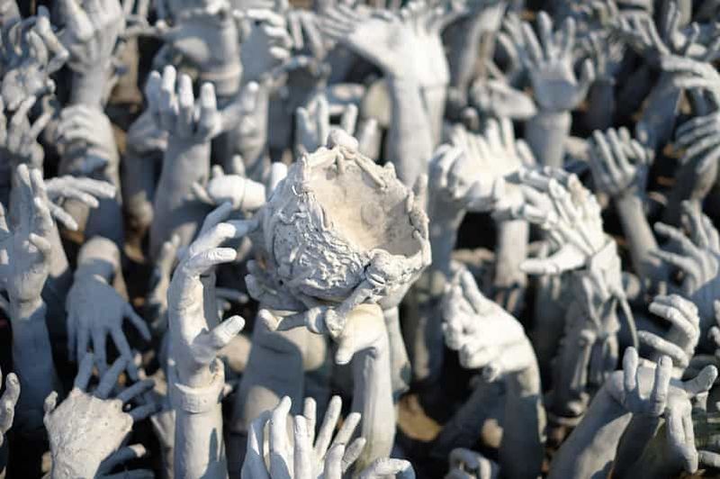 Ce pont représente la traversée des tentations terrestres vers la pureté spirituelle. Conçu avec des mains tendues surgissant d’un gouffre, il illustre le cycle de la renaissance et le chemin vers l’illumination. L’architecte Chalermchai Kositpipat a voulu marquer la séparation entre le monde des désirs et la sérénité du temple. Inauguré en 1997 avec le complexe, ce pont est plus qu’une entrée : il engage le visiteur dans une introspection.