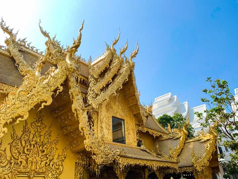 Surprenante particularité du site, ce bâtiment entièrement recouvert d’or sert de toilettes. Construit pour contraster avec la blancheur du temple principal, il représente la dimension matérielle de la vie, à l’opposé de la pureté spirituelle évoquée par le blanc. Le choix de la couleur dorée fait référence à la tentation des richesses terrestres. Derrière son aspect somptueux, il rappelle subtilement le message d’équilibre nécessaire entre l’esprit et les plaisirs mondains.