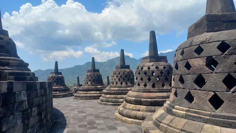 Dominant la terrasse supérieure, le grand stûpa central symbolise l’atteinte de la perfection spirituelle. Autour de lui, quelque 72 stûpas perforés abritent des statues de Bouddha visibles à travers les ouvertures. Construits avec des andésites soigneusement taillées, ces stûpas reflètent une attention pointue aux détails. Chaque structure illustre le concept bouddhique de l’éveil, invitant à la méditation.