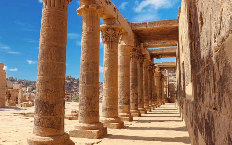 Le Temple de Philae, situé près d’Assouan, émerge comme un joyau de l’Égypte antique, dédié à la déesse Isis. Initialement édifié sur l’île de Philae, il fut déplacé sur l’île d’Agilkia pour le sauver des eaux du Nil, suite à la construction du Haut-Barrage. Ce chef-d’œuvre architectural, avec ses colonnes majestueuses et ses bas-reliefs, témoigne de l’ingéniosité et de la spiritualité de l’époque ptolémaïque.