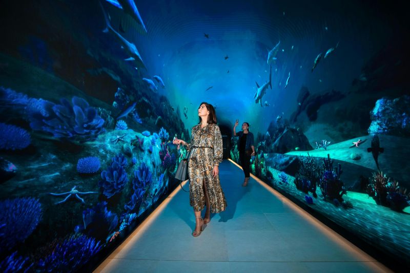 En descendant vers l’espace principal, vous traversez un tunnel aquarium majestueux, peuplé de poissons exotiques et autres créatures marines. Construit pour immerger les visiteurs dans la vie sous-marine du Golfe, ce passage transparent offre une vue à 360 degrés sur des espèces marines mystérieuses. Conçu avec des technologies de pointe, il s’intègre parfaitement à l’ambiance futuriste du site. Une halte idéale pour vous imprégner de la beauté marine avant d’admirer la skyline.
