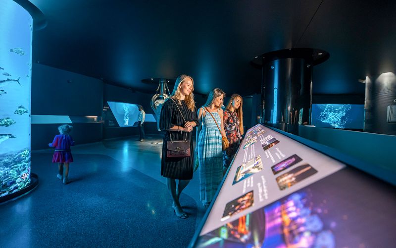 En descendant vers l’espace principal, vous traversez un tunnel aquarium majestueux, peuplé de poissons exotiques et autres créatures marines. Construit pour immerger les visiteurs dans la vie sous-marine du Golfe, ce passage transparent offre une vue à 360 degrés sur des espèces marines mystérieuses. Conçu avec des technologies de pointe, il s’intègre parfaitement à l’ambiance futuriste du site. Une halte idéale pour vous imprégner de la beauté marine avant d’admirer la skyline.
