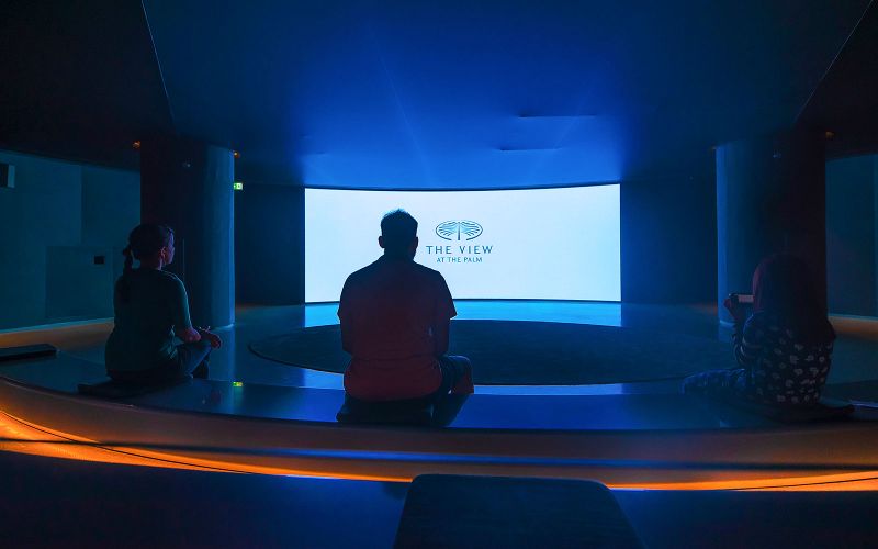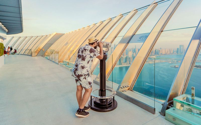 Pour atteindre la plateforme panoramique, rendez-vous à Nakheel Mall. Un parcours multimédia y dévoile la fabuleuse histoire de Palm Jumeirah, depuis ses premières phases de conception jusqu’à son achèvement. Vous suivez ensuite un itinéraire captivant, traversant différents espaces thématiques, avant d’emprunter l’ascenseur menant directement à l’observatoire. Une introduction fascinante vous attend.