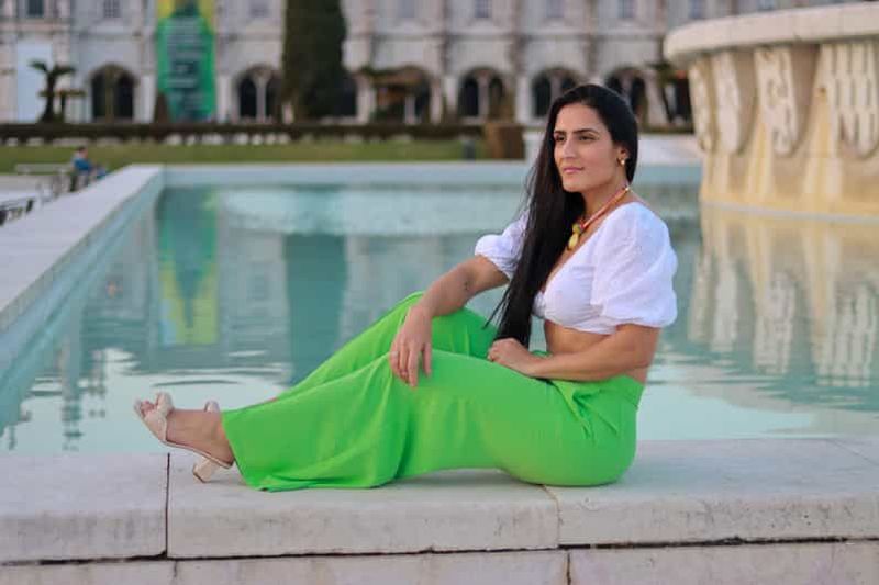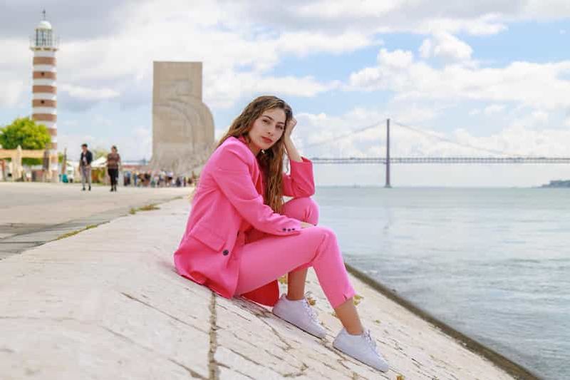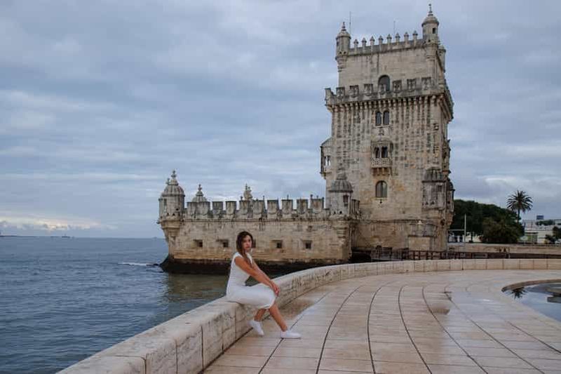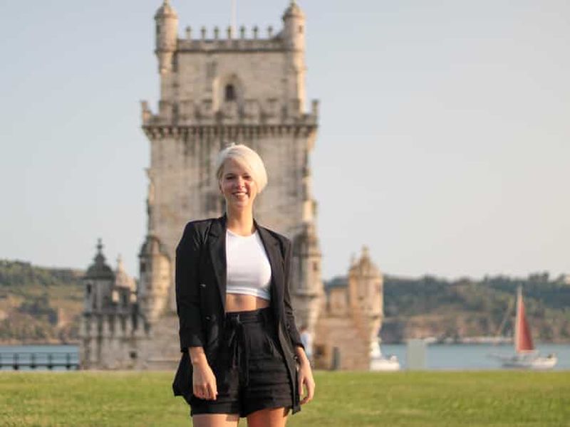 Séance photo avec un photographe professionnel à Belém, Lisbonne. Avec la tour de Belém, le Padrao dos Descobrimentos (m...