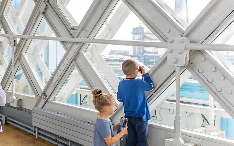 Les passerelles supérieures, inaugurées en 2014, offrent une expérience unique avec leur plancher de verre situé à plus de 40 mètres au-dessus de la Tamise. Vous pourrez y admirer le fleuve, les bateaux et les rues londoniennes qui s’animent en contrebas. Conçues pour relier les deux tours, elles s’inspirent de l’architecture d’époque et offrent une vue panoramique impressionnante.