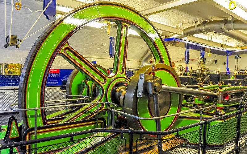 La salle des machines du Tower Bridge abritait autrefois un système hydraulique à vapeur, remplacé depuis par un moteur électrique.