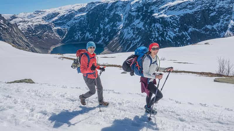 Découvrez le pays des merveilles de l'hiver norvégien lors de cette randonnée guidée en raquettes de 8 à 12 heures jusqu'à la célèbre formation rocheuse de Trolltunga, à partir de Tyssedal ! Nous accueillons les randonneurs et expl