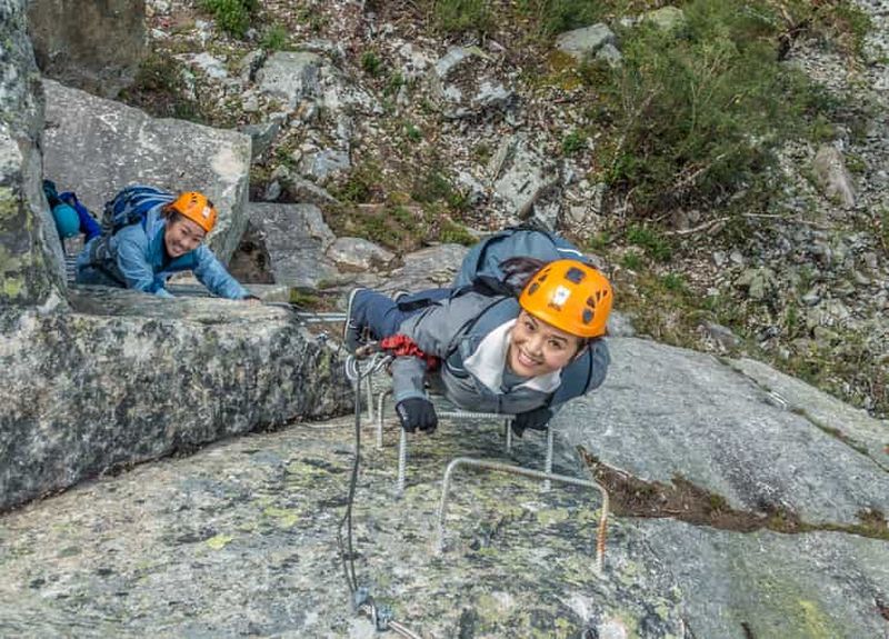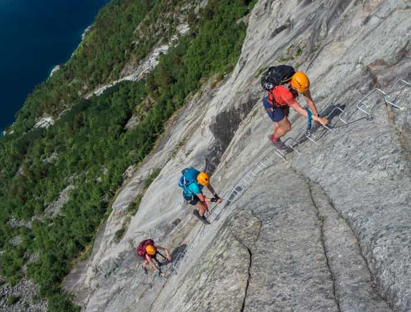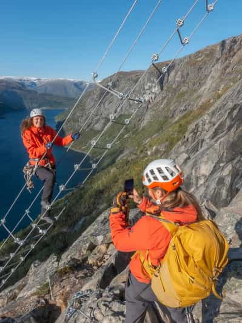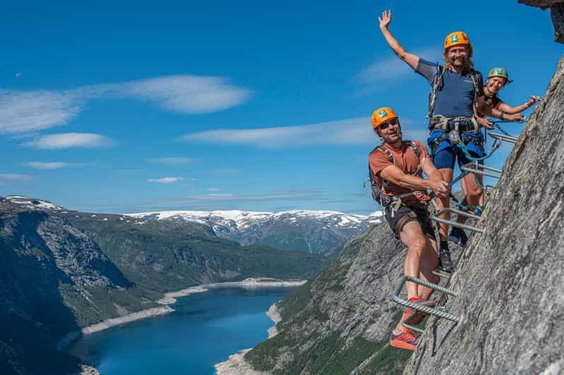 Après une pause rafraîchissante et les consignes de sécurité essentielles, vous pourrez commencer votre ascension. Au fur et à mesure de votre ascension, admirez les vues imprenables sur le lac bleu vif en contrebas, la pittoresque vallée de Ringedalen et le glacier de Folgefonna au loin. Cette expérience d'escalade unique offre certaines des plus belles vues de Norvège !