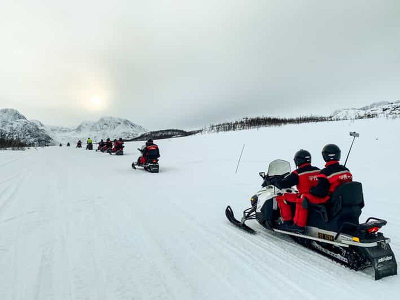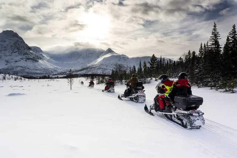 Découvrez les spectaculaires Alpes de Lyngen en conduisant une motoneige dans un paysage magnifique, au Camp Troll, où t...