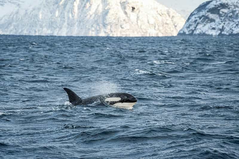 Au départ de Tromsø, vous embarquez sur des catamarans chauffés, bateaux hybrides-électriques ou semi-rigides pour explorer les fjords arctiques et observer les orques, baleines à bosse, rorquals communs, cachalots et parfois dauphins et marsouins. Selon l’excursion, vous naviguez vers Skjervøy, une oasis féerique au nord, ou dans les fjords entourant Tromsø, au milieu de montagnes enneigées, d’un soleil hivernal bas et de paysages glacés spectaculaires.