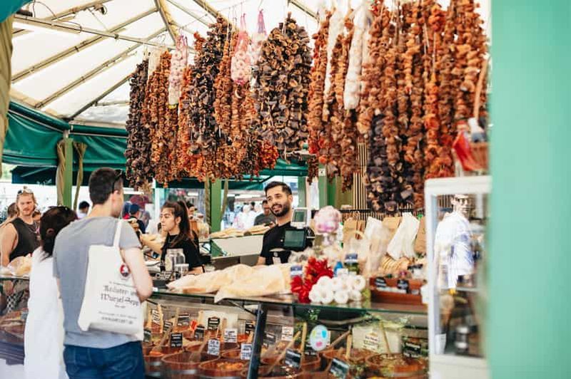 Profitez d'une visite guidée du Viktualienmarkt de Munich et dégustez de délicieux plats régionaux ainsi que des mets in...